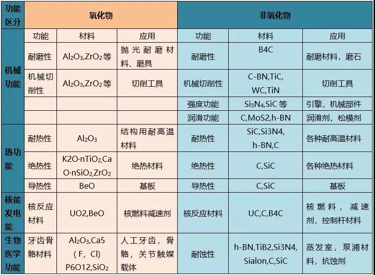 按性能和用途,先進陶瓷可分為功能陶瓷和結構陶瓷兩大類。功能陶瓷主要基于材料的特殊功能,具有電氣性能、磁性、生物特性、熱敏性和光學特性等特點,主要包括絕緣和介質陶瓷、鐵電陶瓷、壓電陶瓷、半導體及其敏感陶瓷等;結構陶瓷主要基于材料的力學和結構用途,具有高強度、高硬度、耐高溫、耐腐蝕、抗氧化等特點,主要包括氧化物陶瓷、氮化物陶瓷、碳化物陶瓷、硼化物陶瓷等。