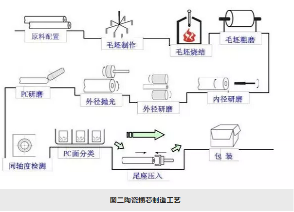 陶瓷插芯制作工藝分兩部分,即毛坯制作和精密機械加工,首先用經(jīng)過特殊處理的采用釔穩(wěn)定的納米氧化鋯粉體原料,造粒后在專用的模具中注射成型,然后經(jīng)高溫燒結(jié)成毛坯,第二部分則是將毛坯經(jīng)一系列精密研磨加工,達到亞微米級的加工精度,從而得到剛性好,精度高的陶瓷插芯產(chǎn)品。