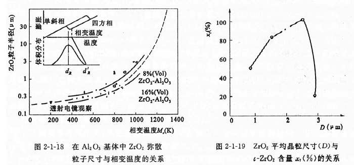 氧化鋯的顆粒尺寸,對相變增韌是有影響的。實踐表明,氧化鋯相變的條件應是單位體積的氧化鋯顆粒數的總能量相當于氧化鋯相變引起的界面能變化。氧化鋯在陶瓷基體中的相變溫度是氧化鋯顆粒尺寸和化學組分的函數,圖2-1-18表明了1696 (VoI) 氧化鋯-A1209和8~6( V01)氧化鋯 -Alz 03系統中的氧化鋯相變溫度與其顆粒度之間的關系。由此看出,在冷卻過程中顆粒大者優先由四方相轉變為單斜相。即氧化鋯彌散于陶瓷基體中的相變溫度M.是隨著氧化鋯顆粒的減小而偏低的。當氧化鋯顆粒小到足以使相變溫度偏移到常溫下,即t-氧化鋯 -直保持到常溫,則陶瓷基體中就儲存了相變彈性壓應變能(,-丁),只有當基體受到了適量的外加張應力,其對氧化鋯的束縛得以解除,才能發生四方相氧化鋯向單斜相氧化鋯轉化。如果氧化鋯顆粒尺寸較大,則其相變溫度處于常溫以上,那么制品冷卻至室溫之前,t-氧化鋯就已自發地轉化為m-氧化鋯。而且氧化鋯品粒尺寸對t-氧化鋯含量的影響也是很重要的。如圖2-1-19所示。從圖中看出,最高的t-氧化鋯的含量只處于很窄的晶粒尺寸范圍內。